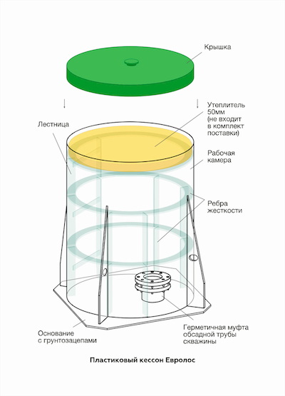 Конструкция изготовлена из монолитного полипропилена толщиной 8 мм, с усилением дна ячеистой полипропиленовой плитой толщиной 80 мм. Кессон имеет герметичную пластиковую конструкцию с ребрами жесткости, встроенной лестницей и крышкой. Его основание снабжено грунтозацепами. В зависимости от своего назначения кессон может быть дополнительно оснащен муфтой обсадной трубы, которая обеспечивает герметичное соединение со скважиной. При использовании изделия в качестве дополнения, например к колодцу, внутри может размещаться: насосное оборудование, фильтры, гидроаккумулятор, запорная арматура, а также разведение трубопровода в разных направлениях, что позволяет сократить затраты на подключение дополнительных потребителей.